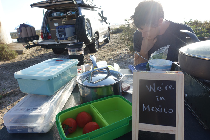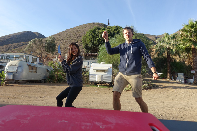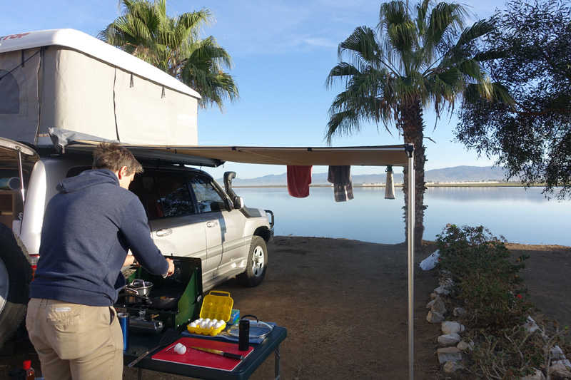 The first challenge was finding a camping site for the night. Thanks to Hyein’s research we managed to score a sweet spot on the lagoon just south of Ensenada. For $5 a night, with shower and wifi…can’t beat it. As soon as we parked the car, a sense of relief came over me.
